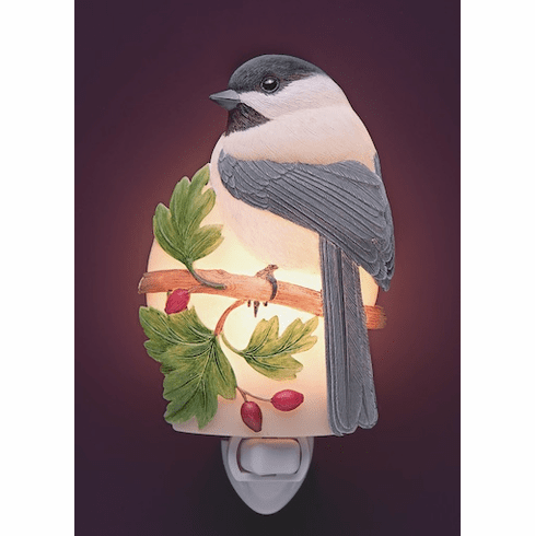 Ibis and Orchid Design New Chickadee Night Light comes to life when lit. A great night light for the bird lovers. Our night lights are beautifully crafted, cast in quality bonded marble and expertly hand painted in a beautiful gift box. A 7-wall bulb is included.